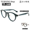 Turning Step TP-348は、純チタン×βチタンの軽量設計と、体温で馴染むSMPパッドが快適なボストン型フレーム。やや縦長のシェイプ(天地41.6mm)で優しく知的な印象を与え、安全性に配慮した蝶番設計でいざという時に顔を守る。後方重心バランスで長時間の装用でも疲れにくい、鯖江製日本製フレームです。